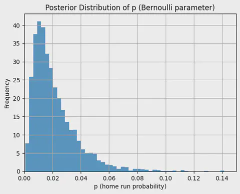 本記事では、大谷翔平選手のホームラン確率を、ベイジアンモデリングを用いて推定します。 今回は、大谷選手の打席データを用いて、ホームラン確率を推定する簡易的なモデルを構築し、そのモデルを用いて、様々な打席状況におけるホームラン確率を予測します。 先日、社外の勉強会後の飲み会で「野球は状態が明確に定義された状態でゲームが進むので、ベイズの当てはまりが良い」って入れ知恵をされたので、考えてみました。 全ての内容はGoogle Colabにてまとめました。