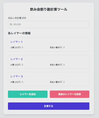 割り勘のツールMay 11, 2025 · 1 min read酔っ払ったときの自分は絶対計算をミスって大事故を起こすため、ツール化しました。割り勘するときにレイヤーごとに重み付けして算出してくれたりします。割り勘ツールLast updated on Feb 1, 2026 Authors金田 佑哉Data Scientist 母数警察アプリ Apr 1, 2025 →
